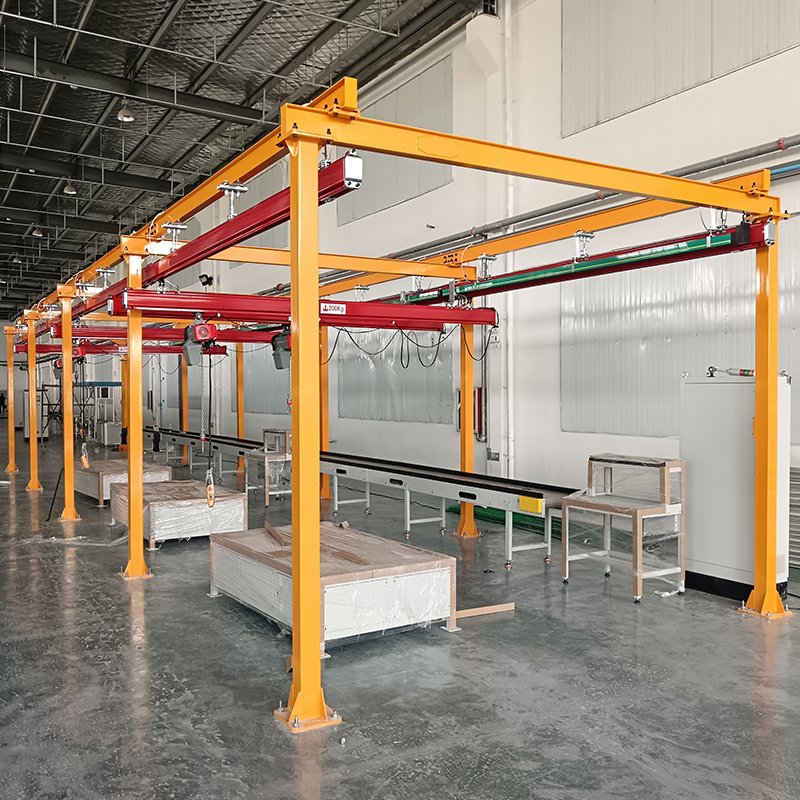 KBK主要由轨道、悬挂装置、行走小车、提升装置和一些功能组件构成,所有模块都为标准组件,可以根据厂房需要进行自由组装。